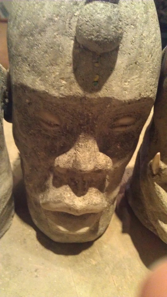 My larger heads are made without moulds. They are entirely hand built; each one is unique and has an individual character. No armature is used, either. Damp mortar is both carved and modelled by hand to achieve the result and the process takes 5+ hours to complete, before curing. All have cowrie eyes, ears and mouth (check between the semi-open lips!) Height varies - 7-10 inches.